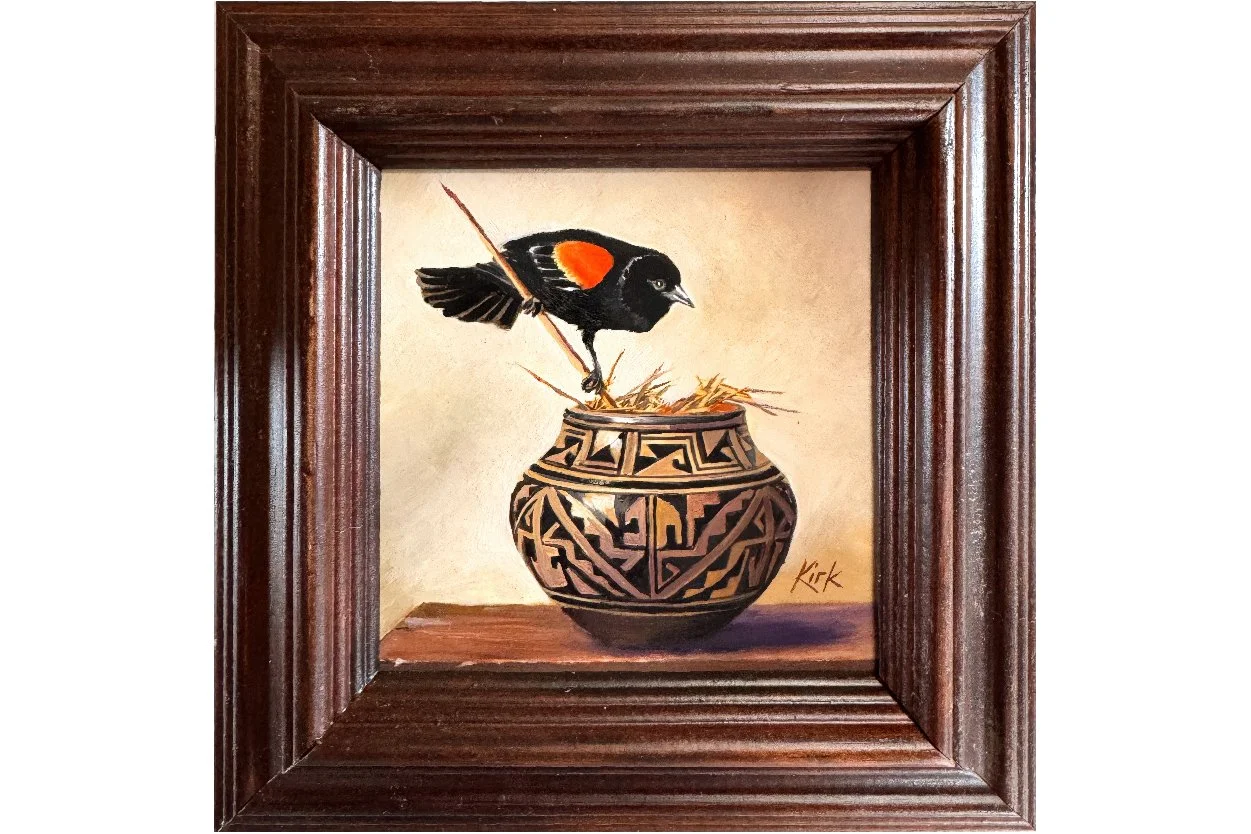 Working from The Field Room — her studio and gallery ten minutes from the center of Taos, on land that has always belonged to something larger than any of us — Kirk works in oil, abstraction, woodblock, collage and assemblage.